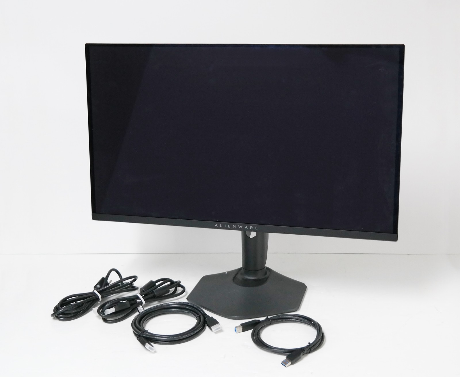 Description: Includes Monitor, Stand riser and base, I/O cover, Power cable, HDMI cable, DisplayPort to DisplayPort, USB 3.2 cable. Scuffs on the back.