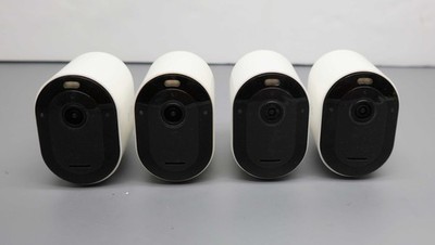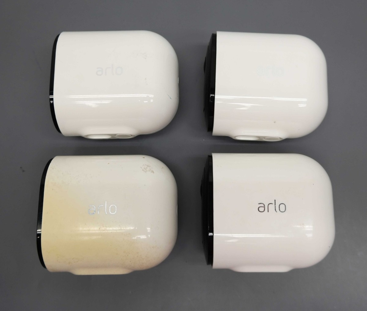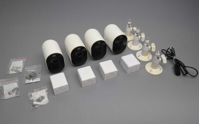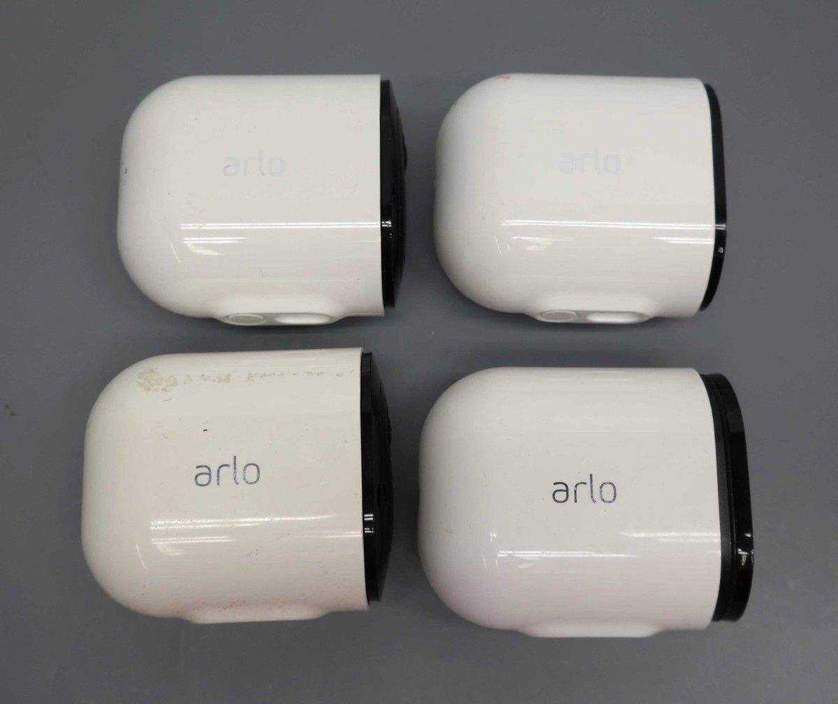 Functional Condition: tested/fully functional Condition: Used/Acceptable - item shows visible signs of use such as scratches, scrapes, scuffs etc. Description: Includes 4 x Arlo Pro 3 cameras, 4 x rechargeable batteries, Magnetic charging cable, 4 x wall mounts and screw kits. Scratched and yellowed bodies of the cameras. Mounts are yellowed. No other accessories are included. |
