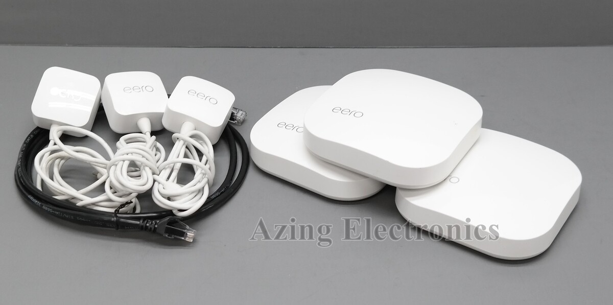 Description: Includes 3 x eero Pro units, 3 x Power adapters, Ethernet cable. Scratches and light discoloration on the bodies.