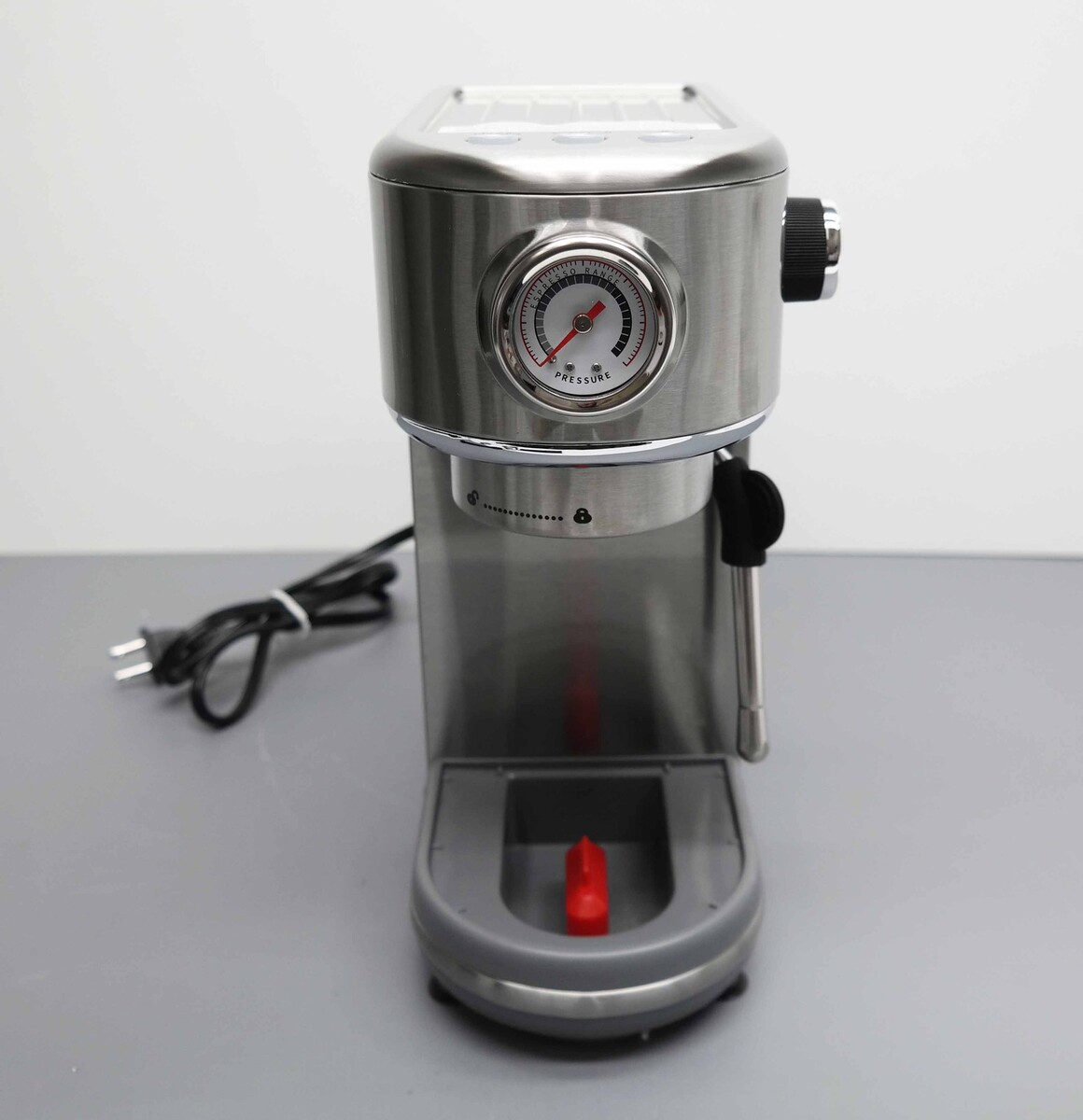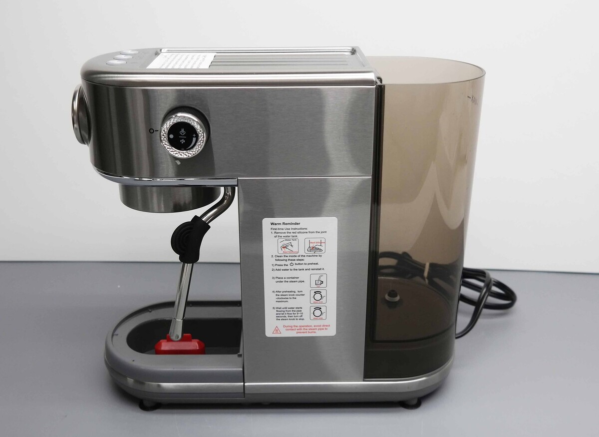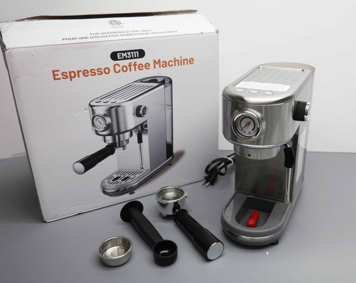 Description: Missing Water Tank Cover and Metal Waste Water Tray. Includes Retail Packaging, Espresso Machine With Milk Frother, 44.4 oz Removable Water Tank, One Cup Filter, Two Cup Filter, Portafilter, Tamper with Spoon.
