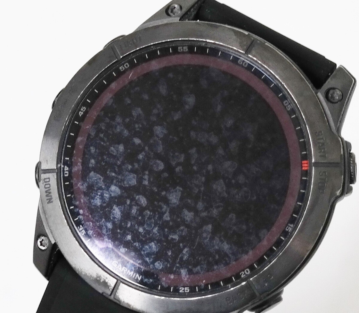 Description: STAIN ON THE GLASS. Does not affect functionality. Includes Smartwatch, Black Band, Charging/data cable. Scratches on bezel.