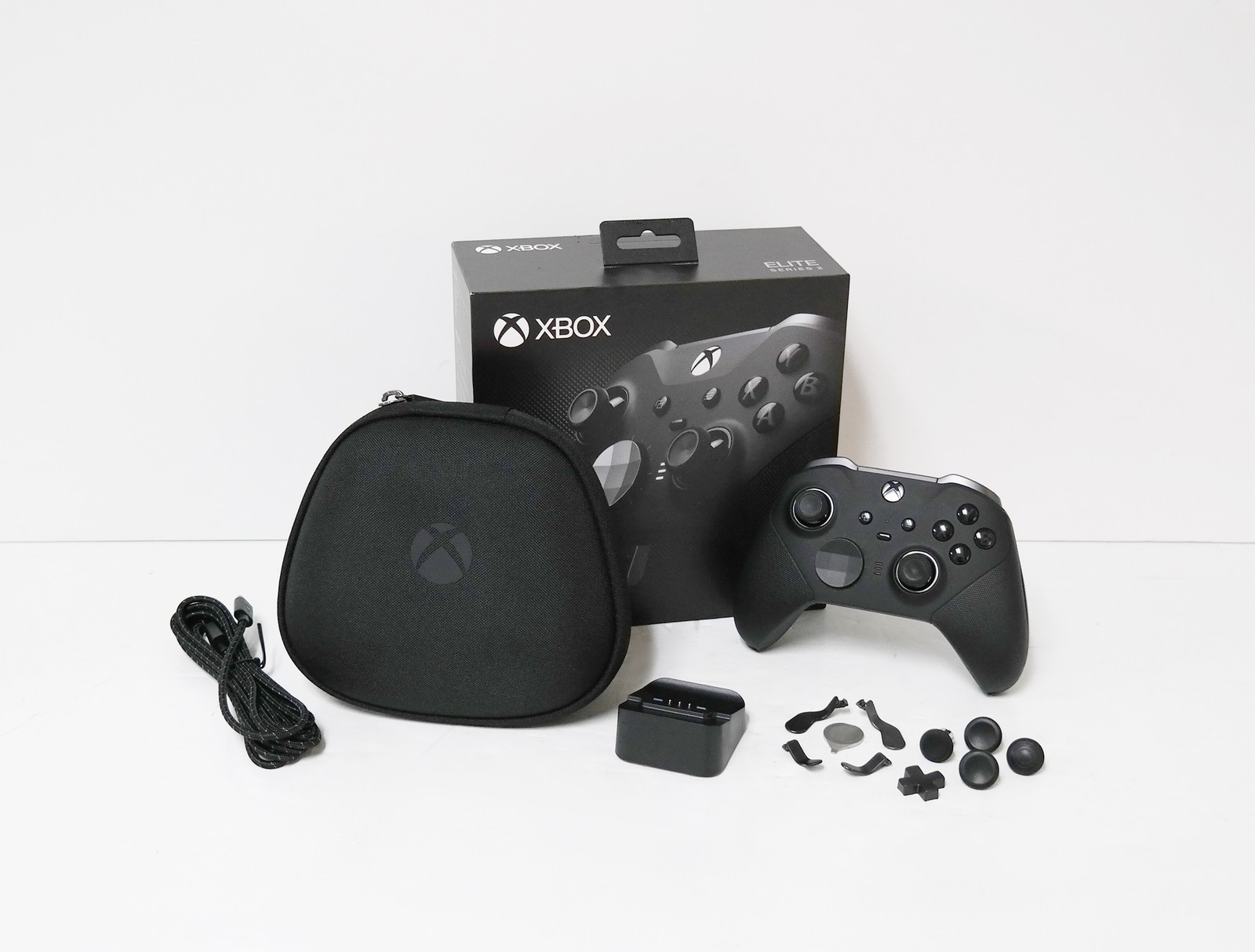 Functional Condition: tested/fully functional Condition: Used/Acceptable - item shows visible signs of use such as scratches, scrapes, scuffs etc. Description: Includes Retail Packaging, Controller, USB-C cable, Charging dock, Carrying case, Set of 6 thumbsticks, Set of 4 paddles, Set of two D-pads, Thumbstick-adjustment tool. Scratches on the body. No other accessories are included. |