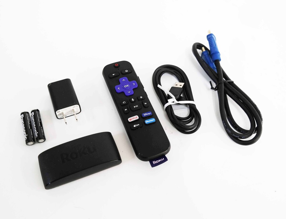 Description: Includes Roku Express 4K+, Power adapter, USB power cable, HDMI cable, Voice remote (Netflix/Disney/ Apple TV+/Paramount+), 2 x AAA batteries. Scratches on the body. Scratches on the remote.
