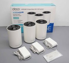 Description: Includes Retail Packaging, 3 x Deco XE75 Pro Units, 3 x Power adapters, 1 x Ethernet Cable. Bodies are yellowed.